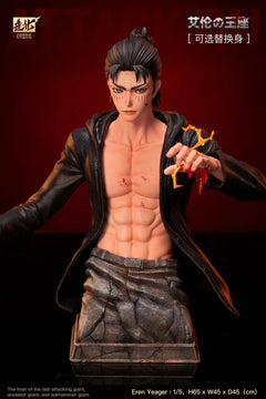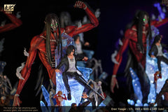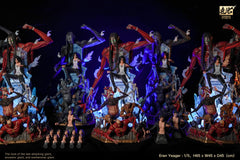 This Eren Yeager 1/5 resin statue by ZaoHua Studio is an overwhelming tribute to the full power of the Founding Titan. Eren sits on a crystalline throne, calm yet terrifyingly resolute, surrounded by the avatars of every titan form tied to his fate. Behind him rises the monstrous, elongated Founder Titan — a skeletal giant with glowing green eyes and a presence that dominates the entire display.