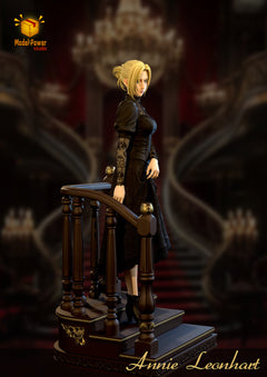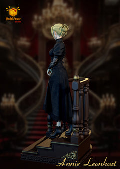 Model Power Studio presents Annie Leonhart in a refined, almost haunting moment of calm before the storm. Dressed in an elegant black gothic dress with intricate lace sleeves and rich fabric textures, Annie stands mid-step on a luxurious staircase diorama, her blonde hair neatly tied back with loose strands framing her cool, unreadable expression. The dark wooden railings, golden ornaments, and multi-layered base create a museum-like scene that feels both noble and intimidating.
