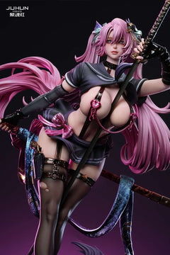 JuHunCREATE brings us a bold and fierce heroine with a playful twist — Demon Slaying Girl Aya. Standing tall in 1:4 scale, Aya strikes a perfect balance between deadly elegance and teasing charm. Her twin pink tails flow like a storm behind her, while her dark school-style outfit, leather harnesses, and twin katanas scream both power and allure. The detailed sculpting of her stockings, ribbons, and katana engravings shows JuHunCREATE’s absolute mastery of resin craftsmanship. Even her little dark fox companion adds a mysterious aura to this mesmerizing display.