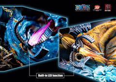 The sculpt captures every sharp detail – from his windswept blond hair and signature curled eyebrow to the tension in his jaw and battle-worn expression. His red coat flares dramatically behind him, while translucent blue resin effects swirl around his leg, enhanced with LED light-up parts that make the flames and water surge with electrifying energy. The dynamic base, packed with shattered wood, splashing water, and a monstrous open maw, makes this piece feel like it leapt straight out of the Grand Line.